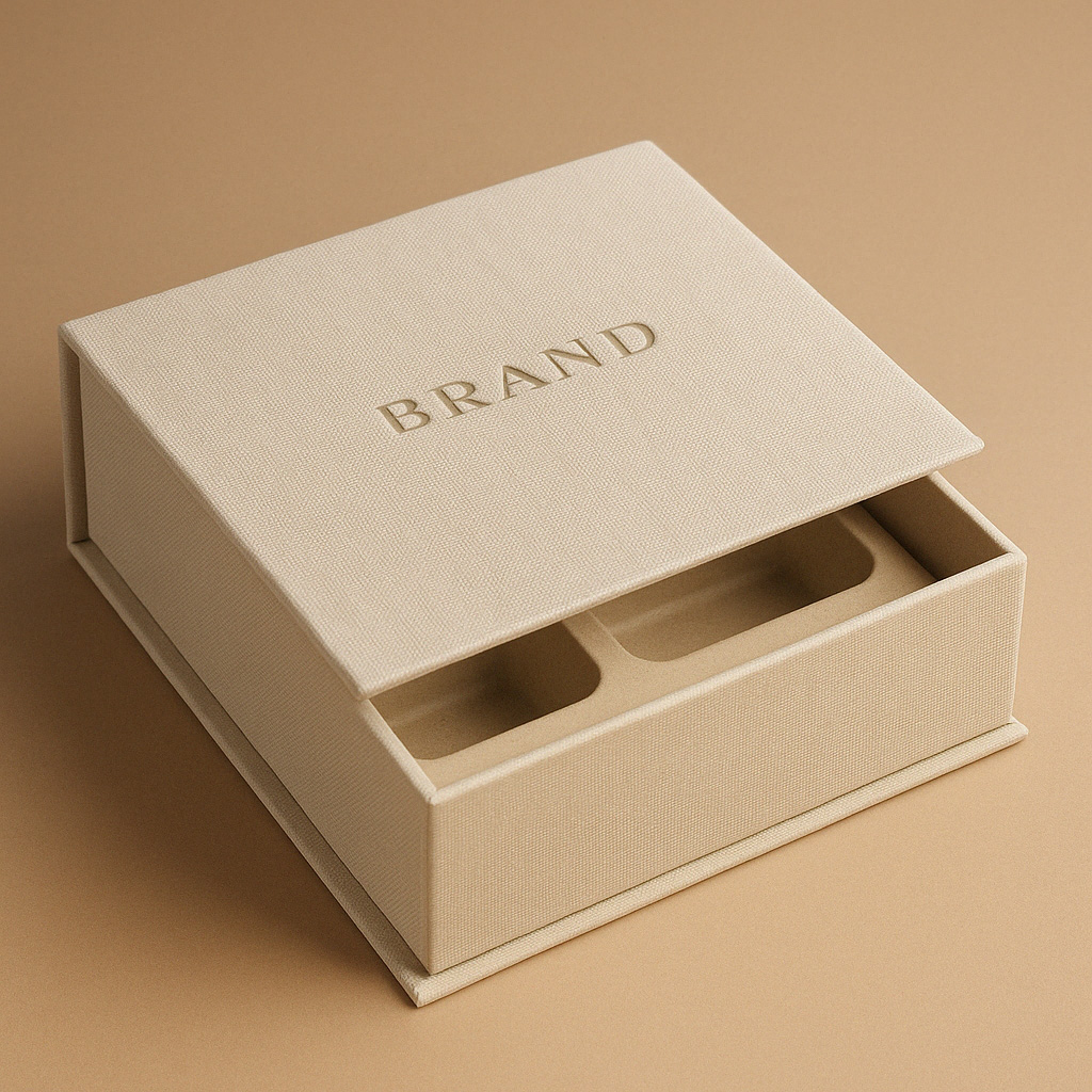 ![]() Textured Linen Box with Magnetic Flap | Linen-wrapped rigid board | Linen texture, blind debossing | Molded pulp insert | Natural luxury with structure | Moderate | 400+ | $$$$ |